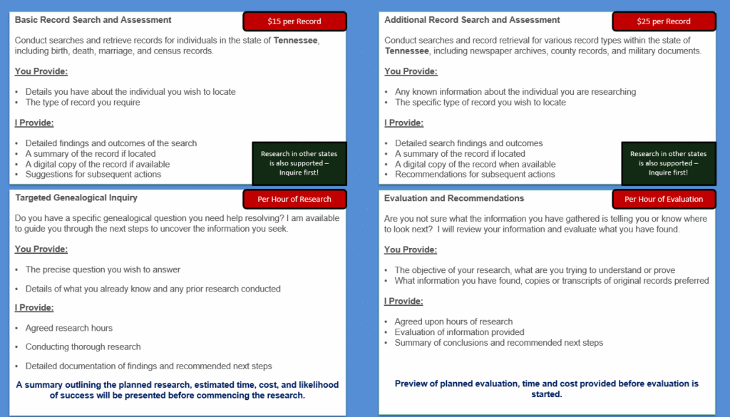 Do you need assistance with obtaining historical records for a specific person? Or maybe targeted research for a specific family history objective? Primary record access will be for information in Tennessee, though I may be able to assist in other states using online repositories.